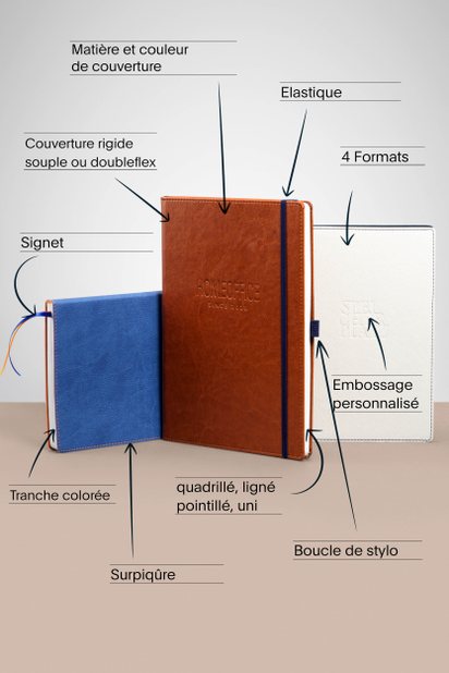 Notre dernière tendance, la couverture Doubleflex, est une combinaison de deux matériaux et n'a plus de support en carton. Il est donc complètement flexible et s'adapte parfaitement à n'importe quel sac. Vous pouvez également choisir parmi plus de 50 matériaux de couverture dans d'innombrables couleurs. Qu'il s'agisse d'un toucher doux, d'un cuir végétalien, d'un papier, d'une texture à l'aspect lin, d'un grain métallique, vous trouverez chez nous tout ce que votre cœur de désire.